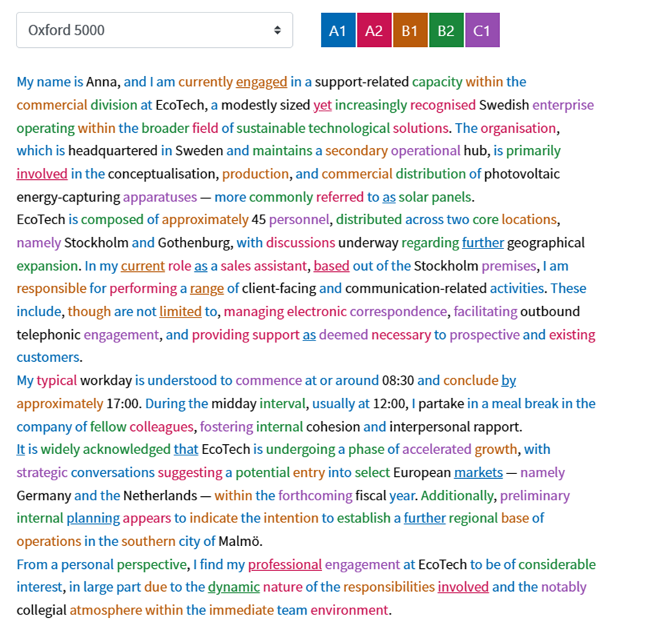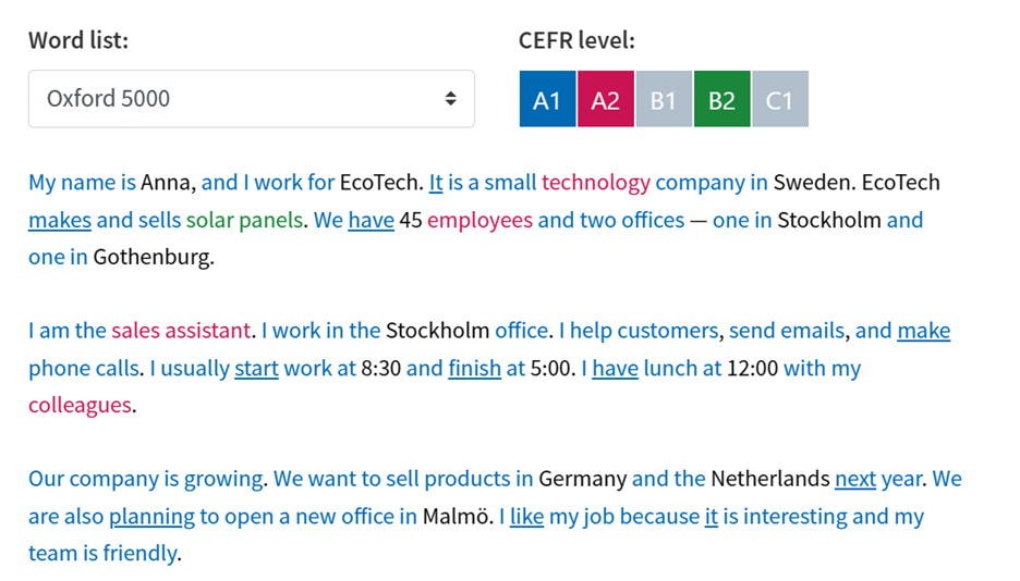 For example, we can see that the words in this text are standard A1 terms with a smattering of A2 vocabulary. We can easily grade the text for an A2 student using these results. This is my primary go-to tool for content writing for language learners.